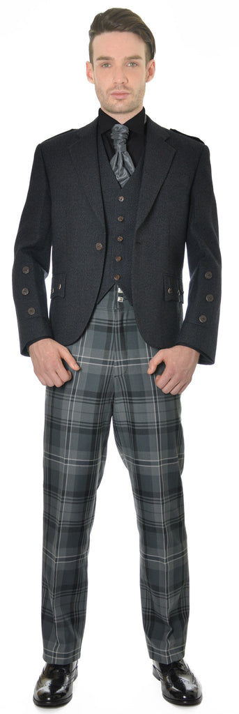 High waisted formal trews, paired with a contemporary charcoal tweed jacket and 5 button vest. Finished with staghorn buttons, this is a fashionable choice, suited for all events.
