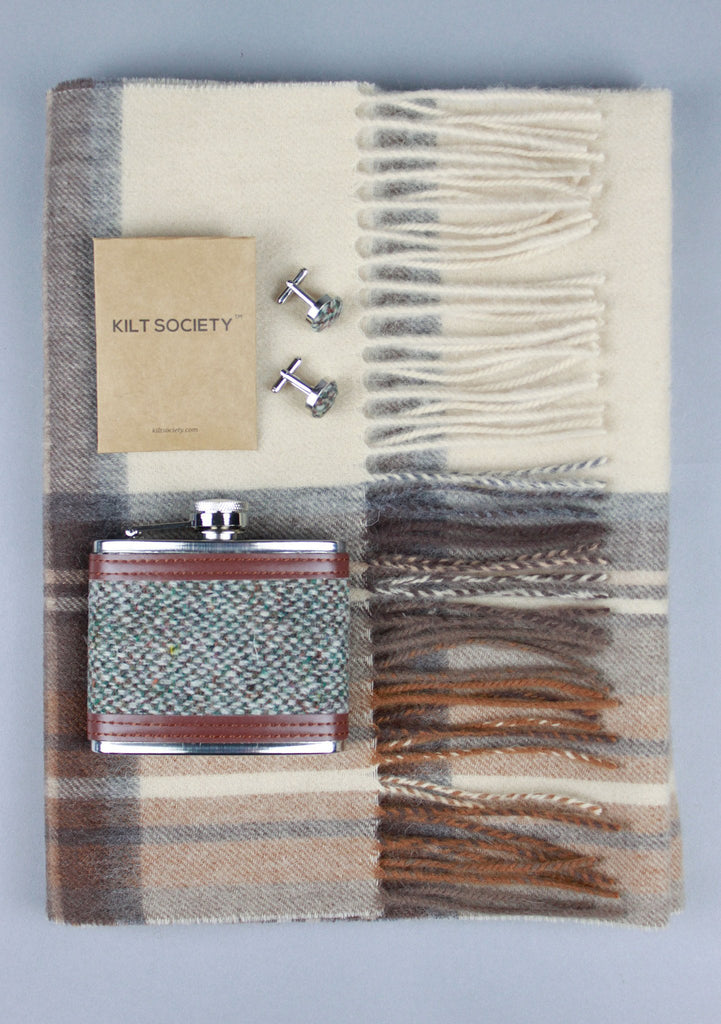 A charming trio of accessories for a truly stylish gentleman. We have combined our Pebble Harris Tweed hip flask, matching Harris Tweed cufflinks and Classic Lambswool Scarf in Stewart Natural Tartan to create a bespoke gift set.