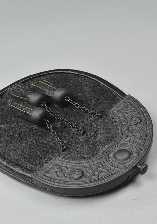 Available in classic Black Bovine, the Full Dress Sporran is traditionally the matching accessory to a formal kilt outfit. Featuring a matte black, Celtic design cantle, three tassels and complete with chain strap.