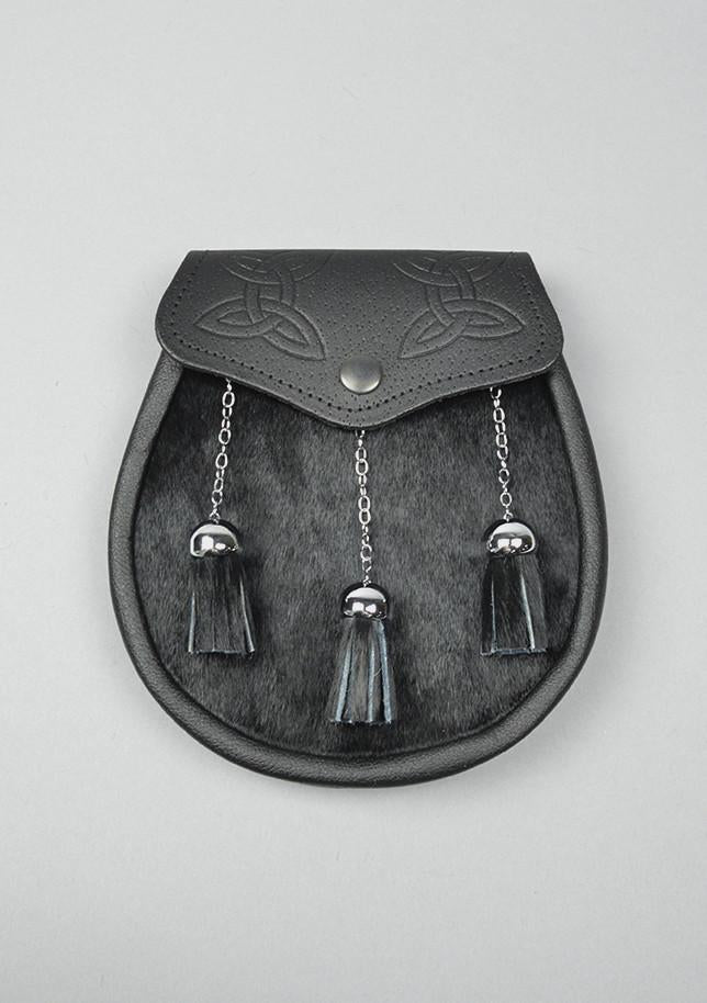 Handcrafted in Scotland, Semi Dress Sporran, with Celtic embossing. Available in both black bovine and natural bovine.