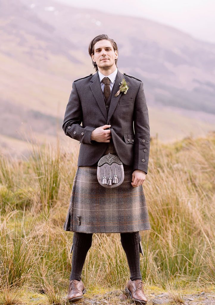 Our model wears the 8 yard kilt, cut from Patriot Tay Tweed. Paired with the Scottish made Braemar jacket, in Charcoal with matching hose and our Oxford brogues, in Tan.