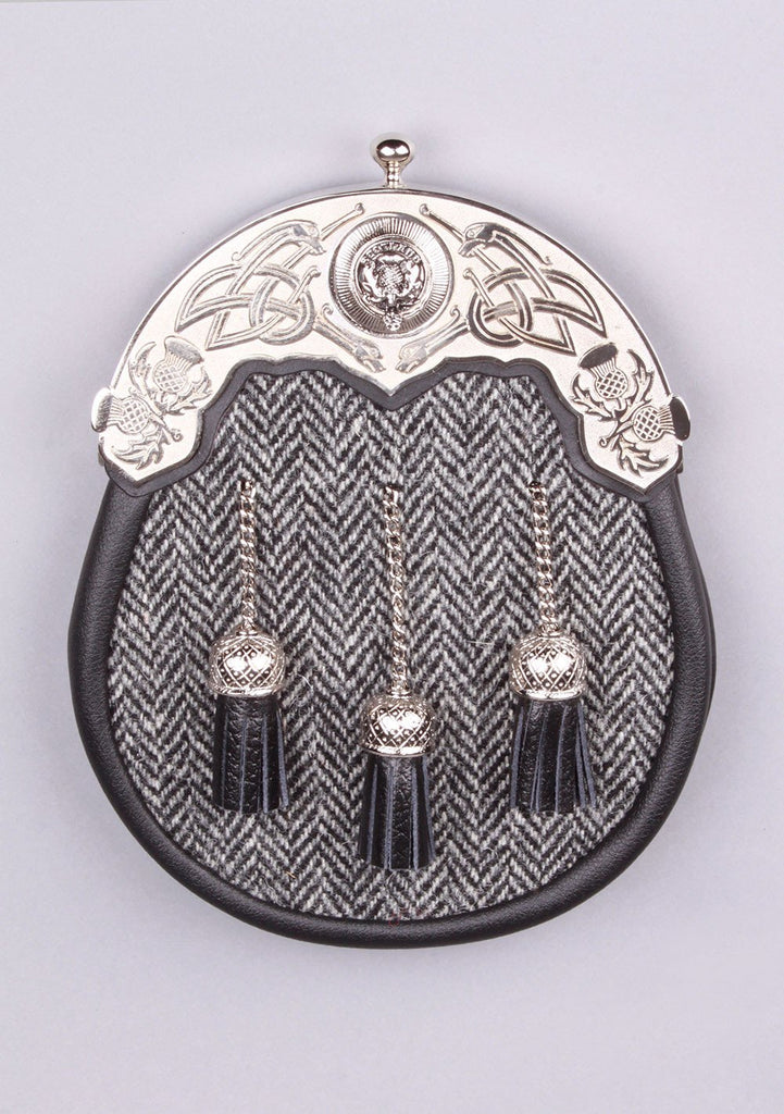 Clan Crest Full Dress Sporran. Made from contemporary Harris Tweed with matching tassels. Customise with your desired choice of Clan Crest.