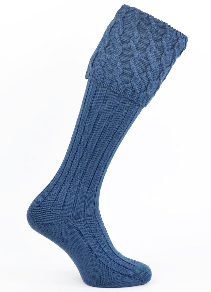 The hand finished hose made from 3 ply merino blend yarn. The addition of acrylic and a dash of nylon improves durability whilst the Lycra adds stretch. A chunky cabled top cuff adds bulk to the top of your leg.